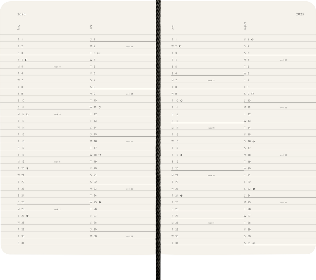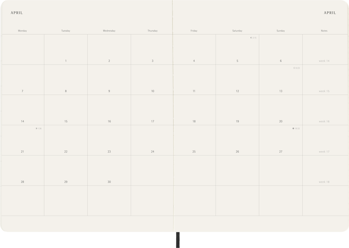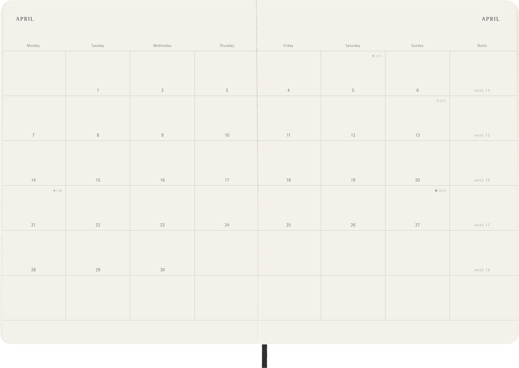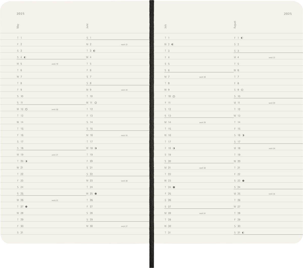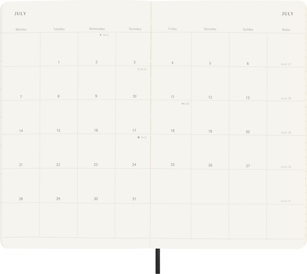 The Moleskine Soft Cover Large Monthly Diary is dated from January to December. This planner shows each month across a two-page spread, followed by a double ruled page between each month for note-taking. 51 ruled pages are included at the end, offering extra space for organizing and planning the year. The perfect combination of freedom and organization. Features: elastic closure, expandable inner pocket, matching ribbon bookmark, Ivory-colored 70 gsm acid-free paper.
