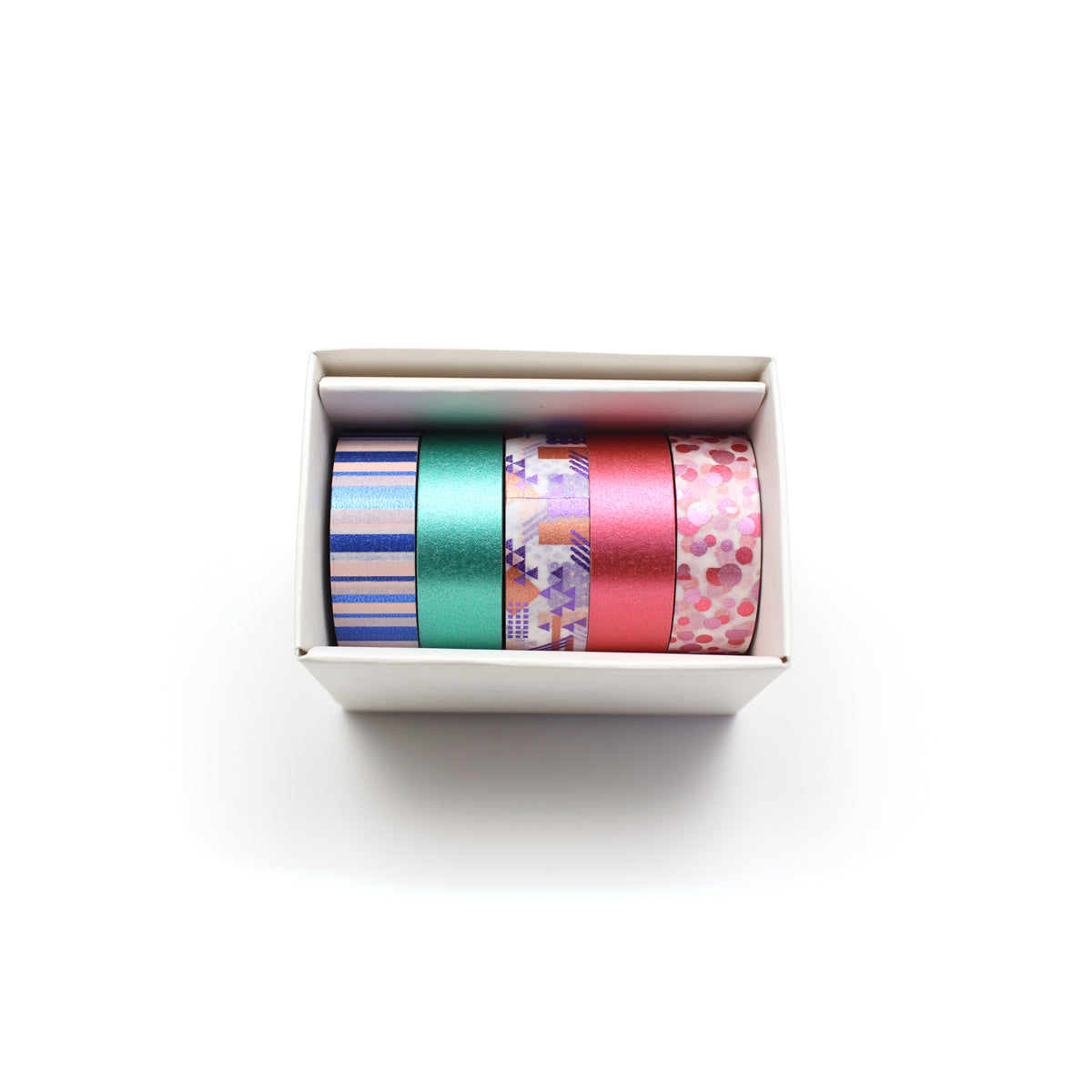 Vibrant and Colourful: The set includes five rolls of washi tape in a variety of bright, cheerful colours and patterns. This gives you a complete colour palette for all your creative needs, from decorating cards and journals to wrapping gifts and decorating packages.