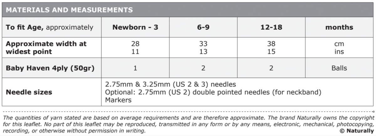 Sizing: The pattern provides instructions for a range of children's sizes, from newborn to 18 months.