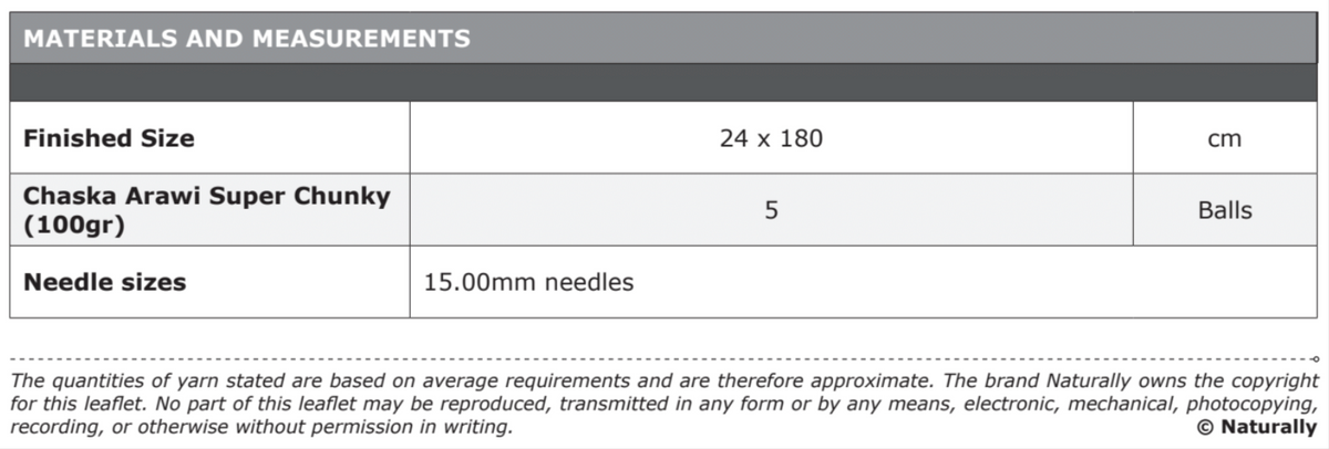 Sizing: The pattern provides instructions for a scarf measuring 180cm x 24cm.