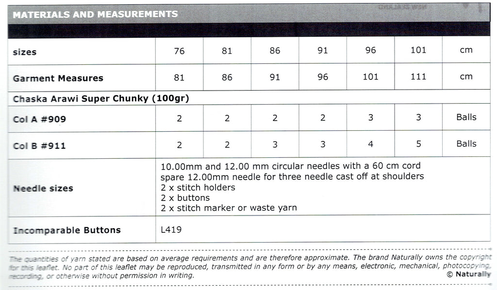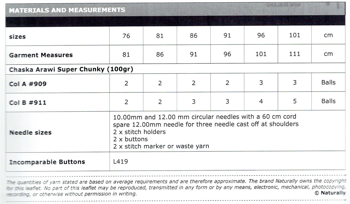 Sizing: The pattern provides instructions for a range of adult chest sizes, from 76cm to 101cm.