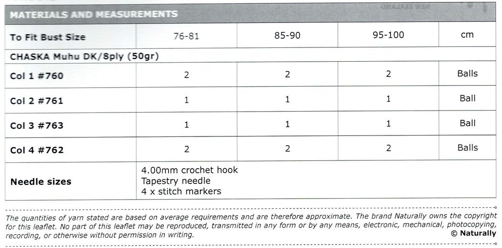 Sizing: The pattern provides instructions for a range of adult chest sizes, from 76cm to 100cm.