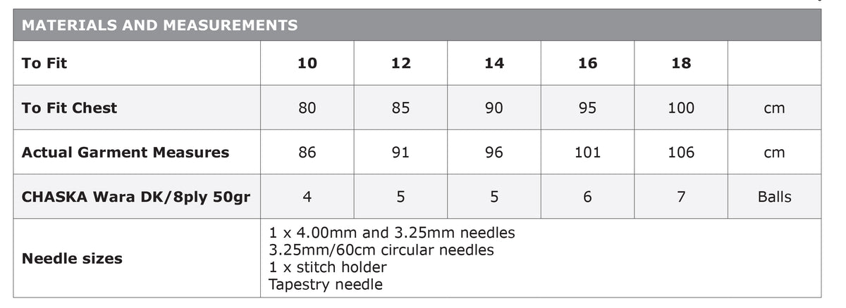 Sizing: The pattern provides instructions for a range of adult chest sizes, from 80cm to 100cm.