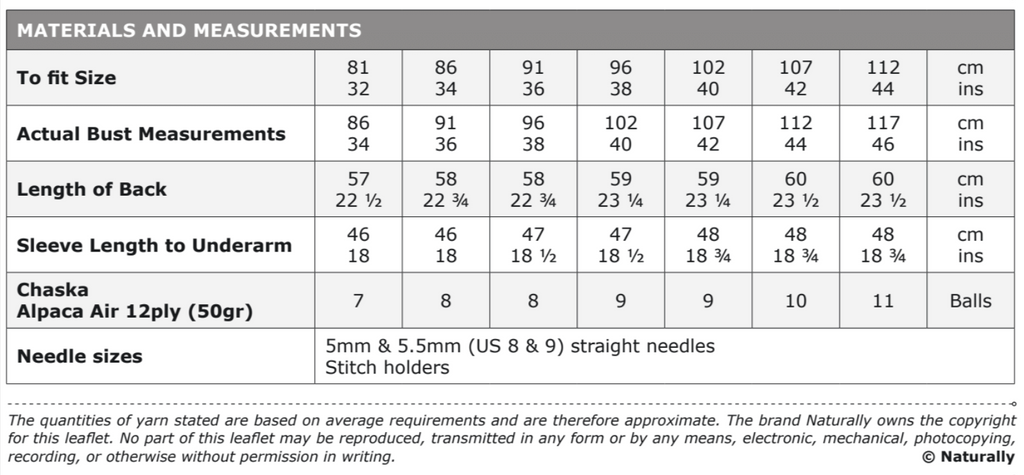 Sizing: The pattern provides instructions for a range of adult chest sizes, from 81cm to 112cm (32-44 inches).