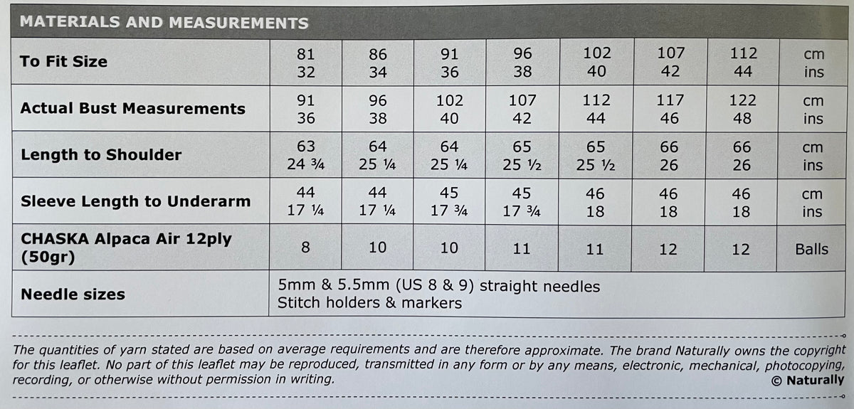 Sizing: The pattern provides instructions for a range of adult chest sizes, from 81cm to 112cm (32-44 inches).