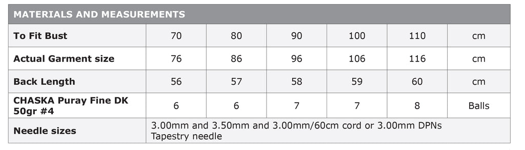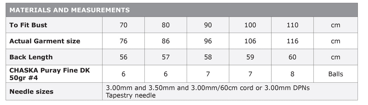 Sizing: The pattern provides instructions for a range of adult chest sizes, from 70cm to 110cm.