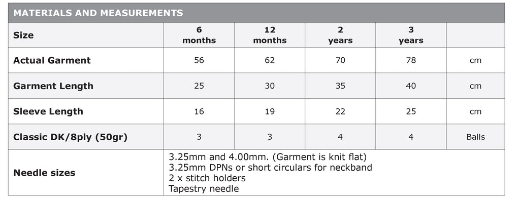 Sizing: The pattern provides instructions for a range of children's sizes, from 6 months to 3 years.
