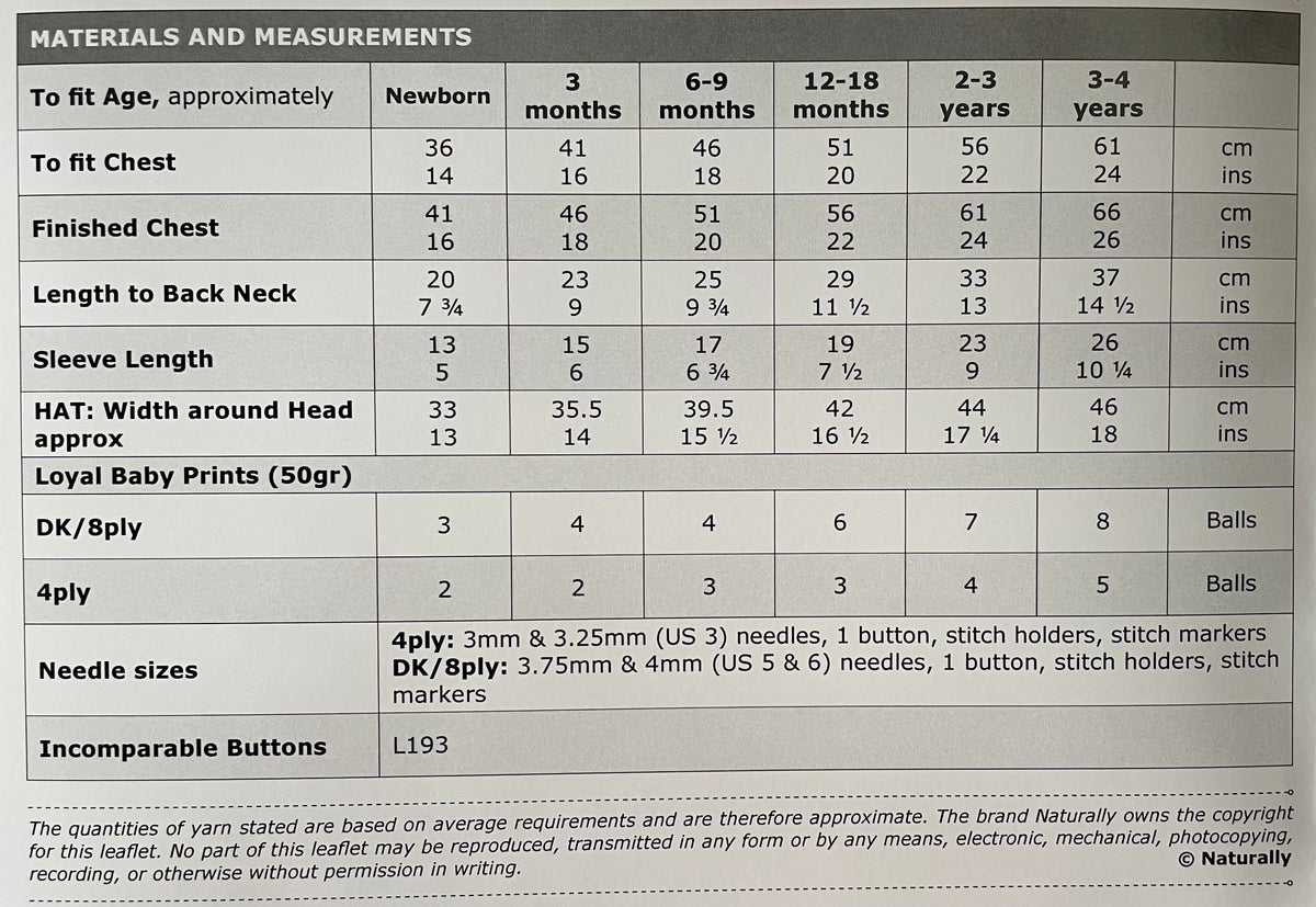 Yarn Recommendation: The pattern is designed for a combination of Naturally Loyal Baby Prints 4ply yarn and Loyal Baby Prints DK 8ply yarn. This high-quality yarn will ensure the finished garments are both soft and beautiful. The print effect will also add a unique, colorful pattern to the finished garments.