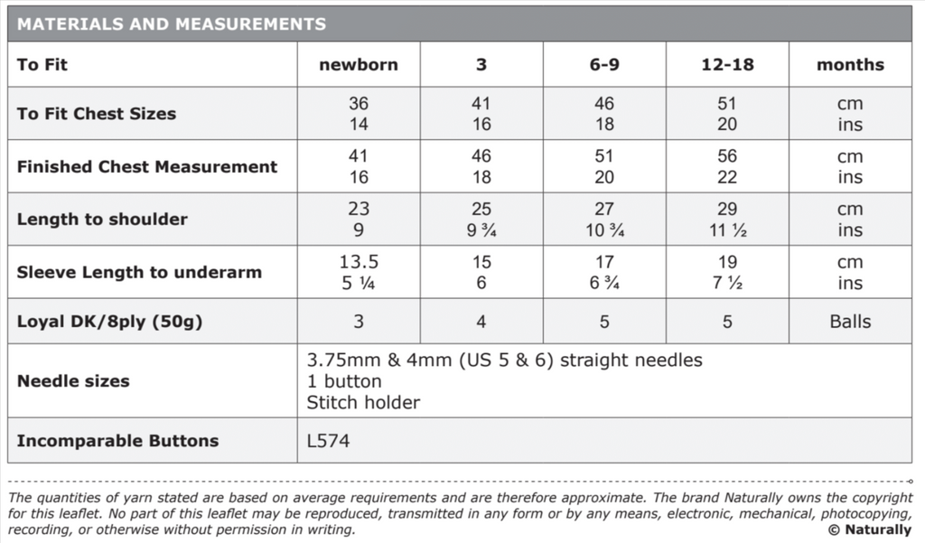Sizing: The pattern provides instructions for a range of children's sizes, from newborn to 18 months.