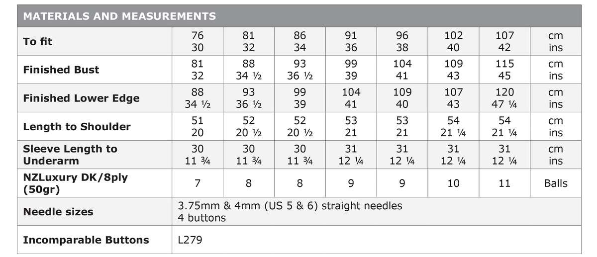 Sizing: The pattern provides instructions for a range of adult chest sizes, from 76cm to 107cm (30-42 inches).