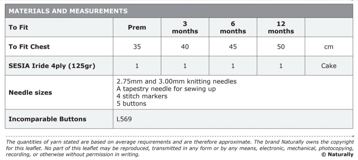 Sizing: The pattern provides instructions for a range of children's sizes, from 0 to 12 months.