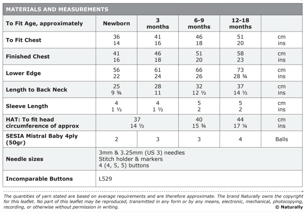 Sizing: The pattern provides instructions for a range of children's sizes, from newborn to 18 months.