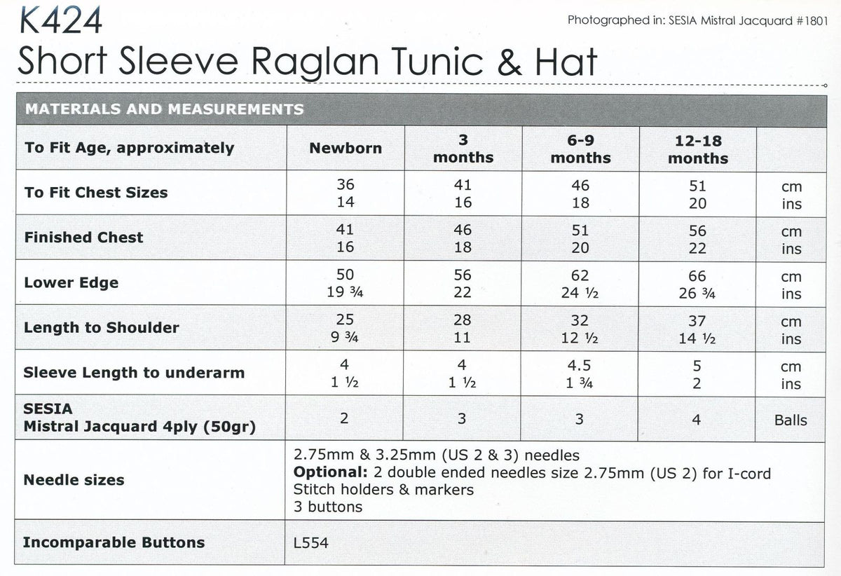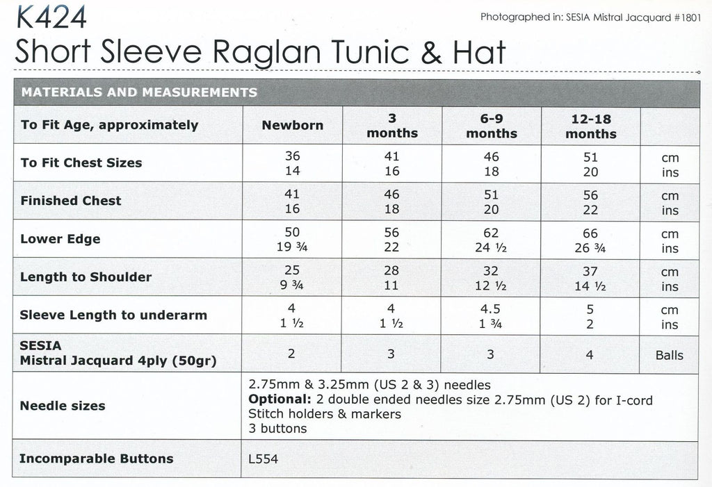 This is a knitting pattern for a charming children's outfit, including a tunic and hat. The pattern is designed for infants aged from newborn to 18 months and uses 4ply yarn.