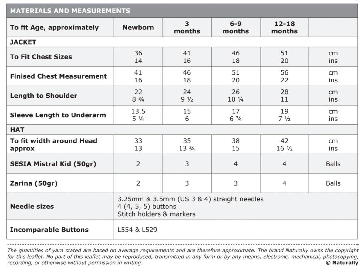 This is a knitting pattern for a charming children's outfit, including a jacket and hat. The pattern is designed for children aged from newborn to 18 months and uses 4ply yarn, offering a delicate and fine finished garment set.