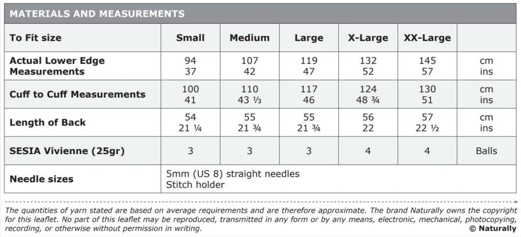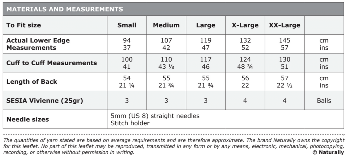 Sizing: The pattern provides instructions for a range of adult sizes, from S to 2XL.