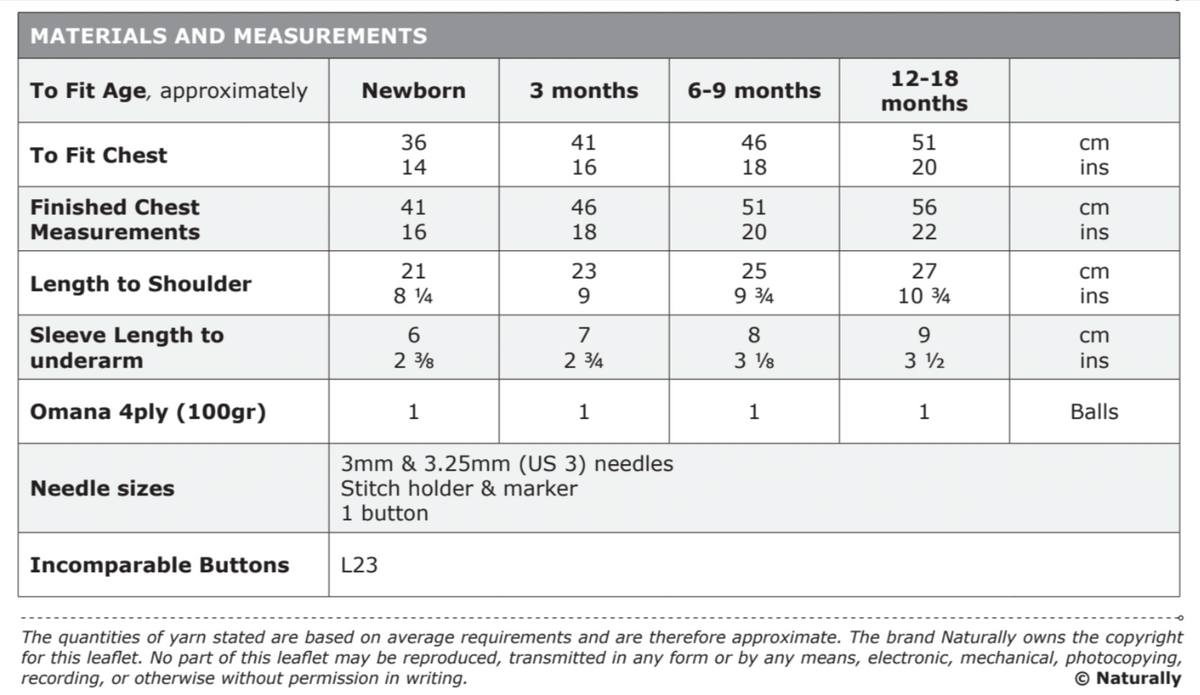 Sizing: The pattern provides instructions for a range of infant sizes, from newborn to 18 months.