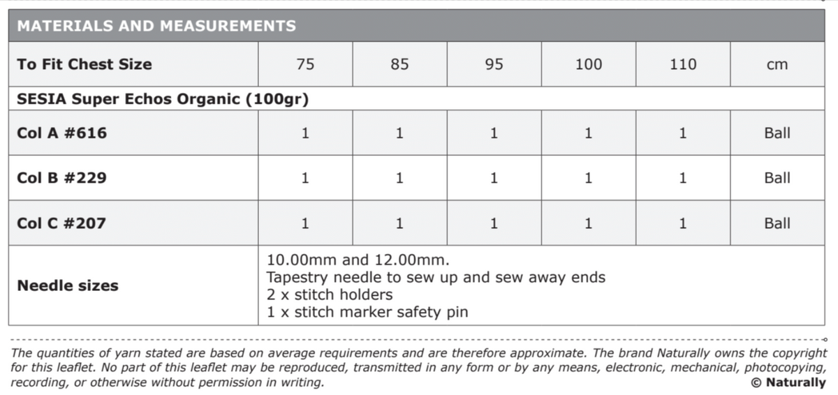 Sizing: The pattern provides instructions for a range of adult chest sizes, from 75cm to 110cm.