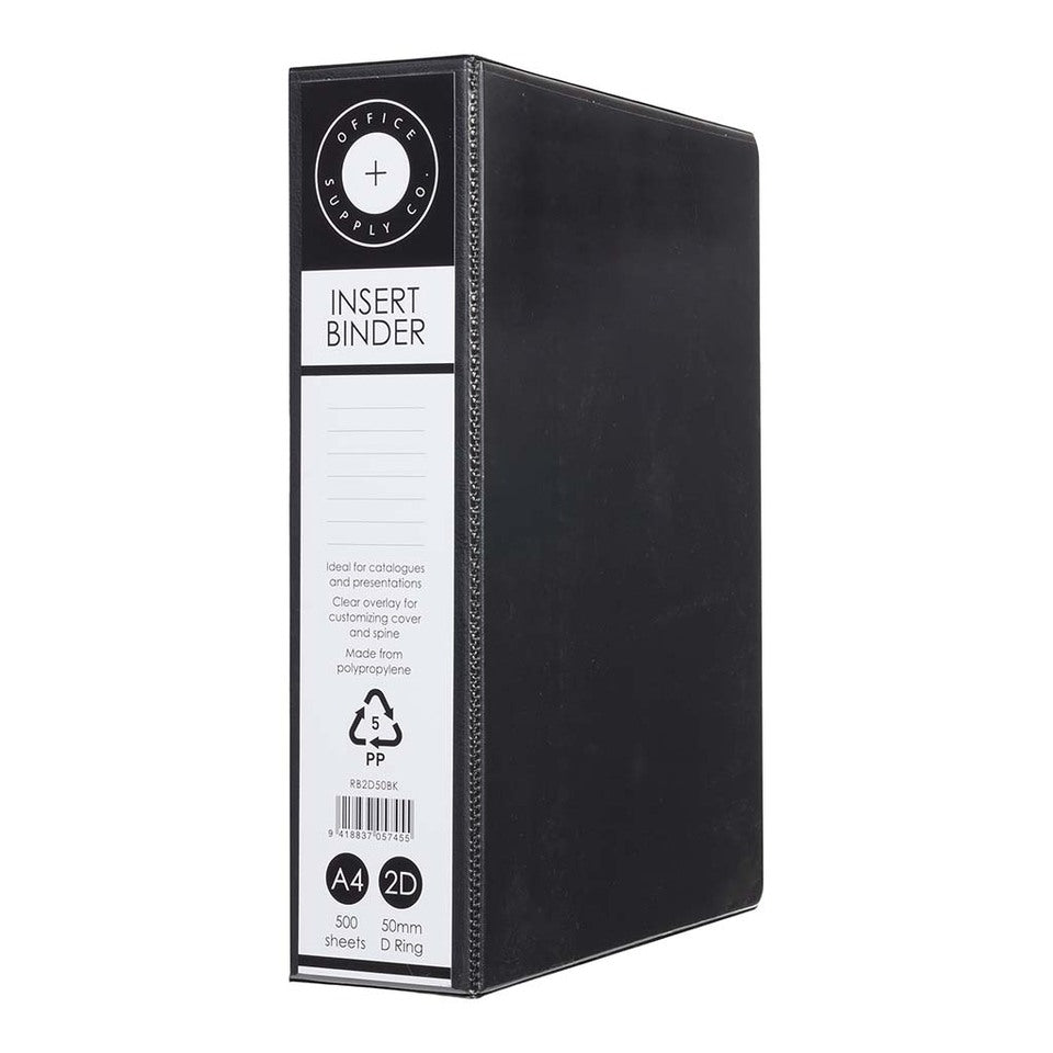 This Insert Binder features 2 D-rings, 50mm diameter in capacity that holds up to 300 sheets of office paper. These Insert Binders are the sustainable option to your filing solution. Constructed from 100 percent recycled board, and recyclable polypropylene. Clear overlayed webbed front, back and spine cover insert ideal for presentations, conferences, proposals or reports. Clear pockets are also located on the inner board front and back covers. A4 size. 2D 50mm rings. Black colour.