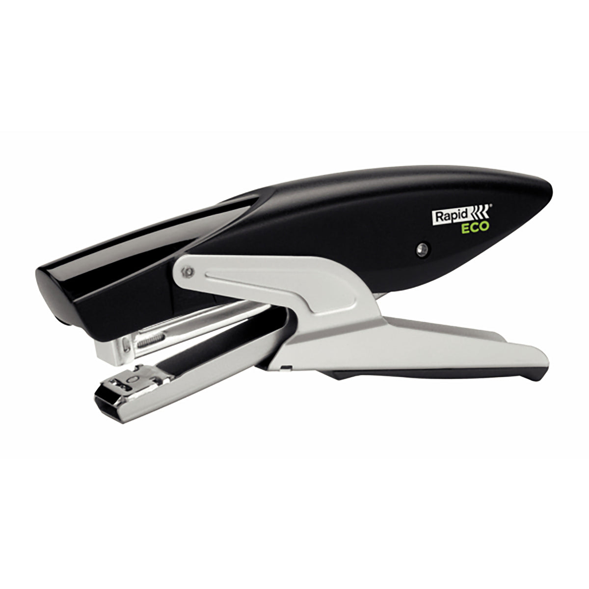 Housing made from 100% post-consumer recycled plastic. The packaging is printed with petroleum free soy-based ink, with recycled cardboard, and glued using water based adhesive only. Recylable, detachable parts. Staples up to 20 sheets of paper (80 gsm). Housing made of 100% recycled plastic (post-consumer recycled ABS). The packaging is made of recycled cardboard. Adjustable anvil for stapling and pinning. Convenient, top loading refill mechanism. For 24-26/6 Rapid staples. Stapling depth: 55mm
