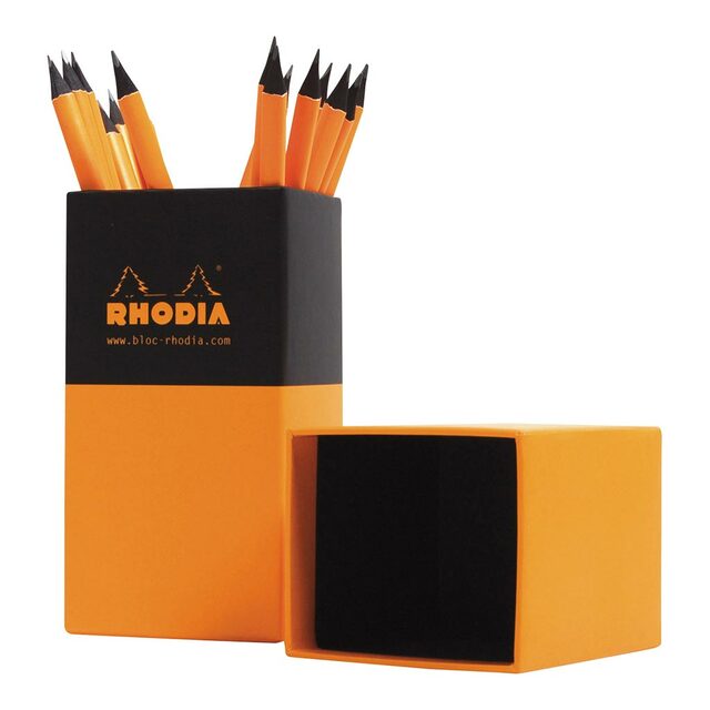 Blackwood triangular Pencil in classic Rhodia Orange with an eraser on the end.