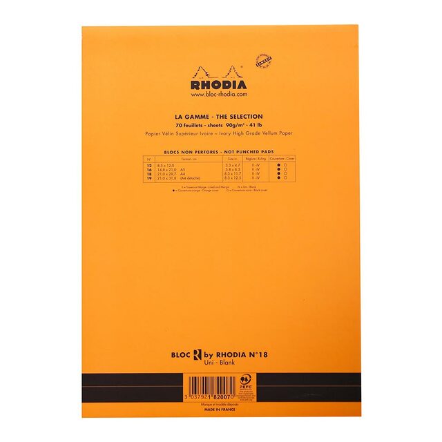 Plus the usual features of the classic Rhodia Bloc pad: the cover is scored so it will fold neatly back over head, patented double back – no staples exposed to scratch your surface, microperforated sheets for easy removal.