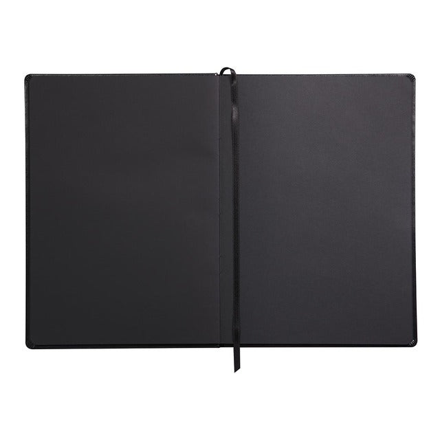 The Carb'ON Black Book features a Italian leatherette hardcover, elastic closure, Rhodia Touch embossed cover, 56 non-perforated sheets and ribbon bookmark.