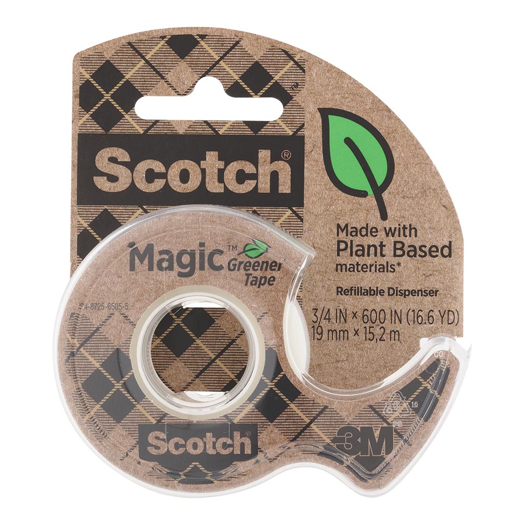 Scotch Magic Greener Tape is a more environmentally friendly version of the original matte-finish, invisible tape, with the same great performance made from over 65% recycled or plant based material. Ideal for homebased permanent paper mending. It comes with the easy to use Scotch Tape Dispenser, so the tape glides off smoothly, cuts evenly, with no waste. 19mm x 15.2m.