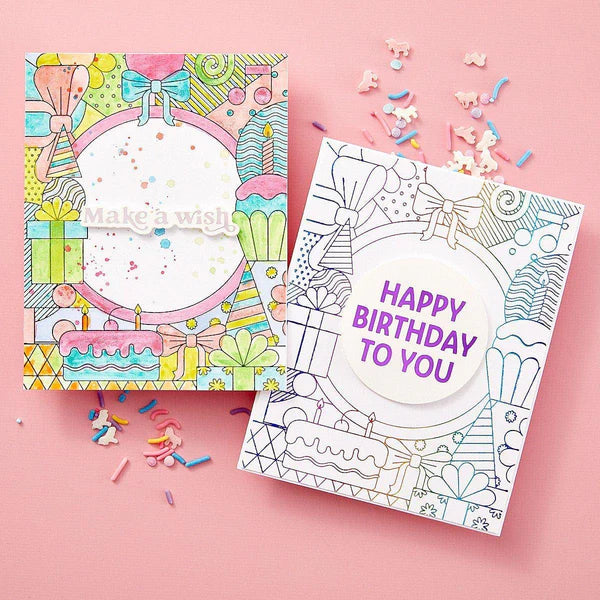 The Spellbinders Birthday Bash Press Plate & Die Set (BP-196) is a lively and festive centerpiece from the Birthday Bash Collection by Simon Hurley. This smart set is designed to take the guesswork out of creating a full-panel birthday card, featuring a cheerful collage of party icons - gifts, cakes, hats, and musical notes - that perfectly frame a central sentiment.