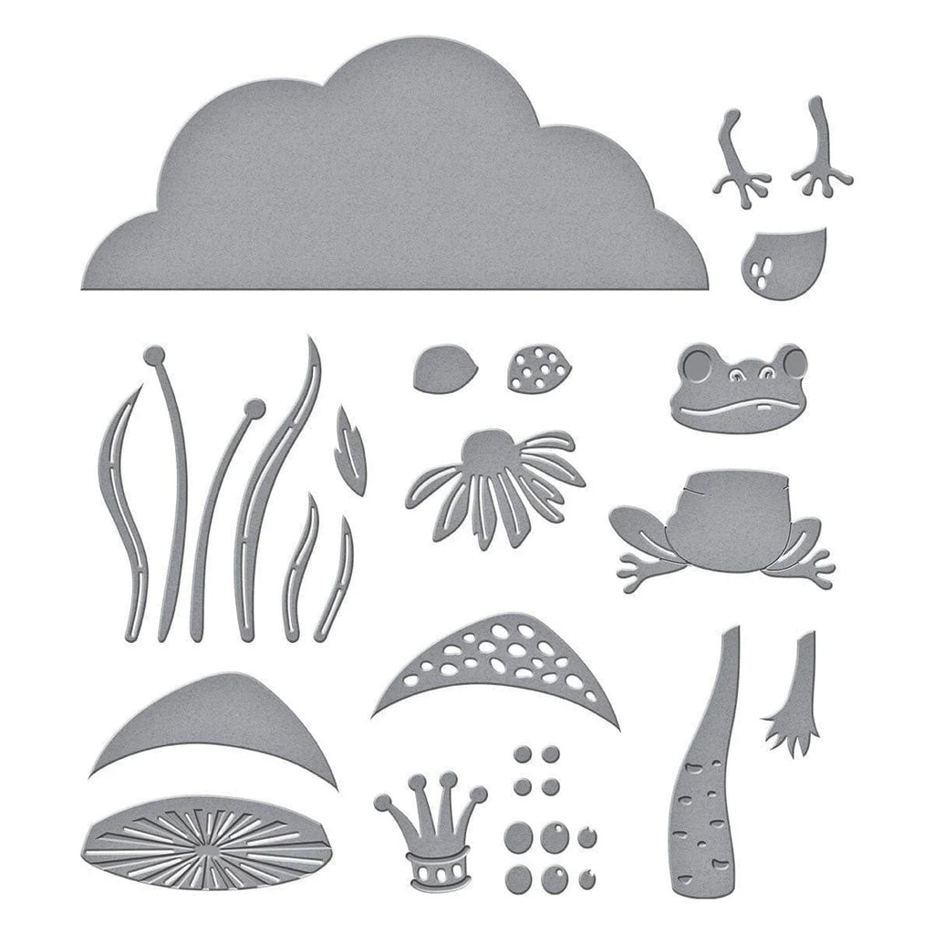 The Spellbinders Frog Prince Etched Dies (S4-1356) is a whimsical and high-value set from the Jump for Joy Collection. This massive 18-piece die set is a scene-builder that allows you to create an adorable, crowned frog character along with its entire magical habitat. With separate dies for the frog's belly, eyes, and crown, plus a variety of mushrooms, grasses, and clouds, you can create a complete story on your card front with just one set.