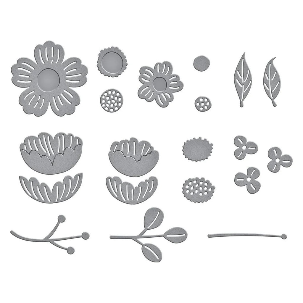 The Spellbinders Little Blooms Etched Dies (S2-380) are a sweet and versatile set from the Out and About Collection (2024). This set of eight thin metal dies is designed to assemble into a delightful bouquet of friendly flowers or be used as individual accents. These dies feature a mix of five-petal blooms, side-profile flowers, and delicate sprigs, making them a perfect companion for cards, tags, and mixed-media journals that need a touch of natural beauty.