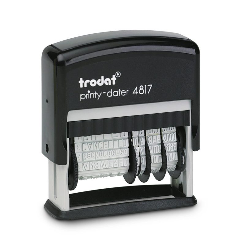 Trodat printy 4817 comes ready-to-use with 12 frequently needed phrases: answered, received, entered, backordered, e-mailed, paid, cancelled, checked, shipped, billed, delivered and faxed. Just turn the wheels of the band and select your required phrase. Versatile self-inkingdater with 12 different office applications in one stamp. The text prints in front of the date. The date has the height of 3.8 Mm and the format: day, month (in letters) and year. Size of the imprint is 50 x 5 mm. Suitable replacement ink pads 6/4817 in black, blue, red, green and violet are available to further extend the life of your self-inking stamp. Being one of trodat's bestsellers, the stamp is climate-neutral: with 70% of recycled plastic.