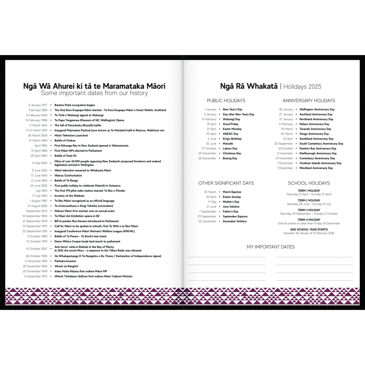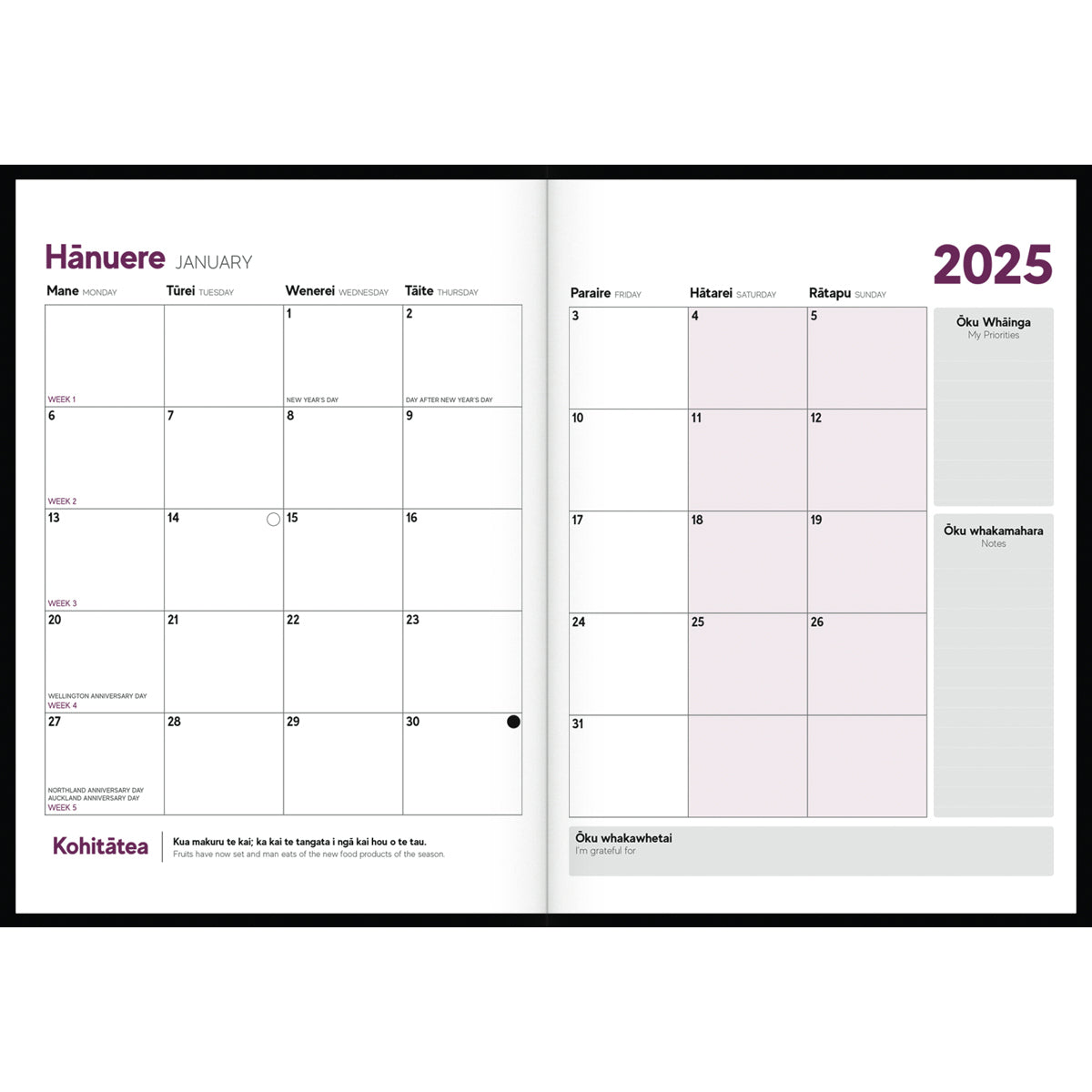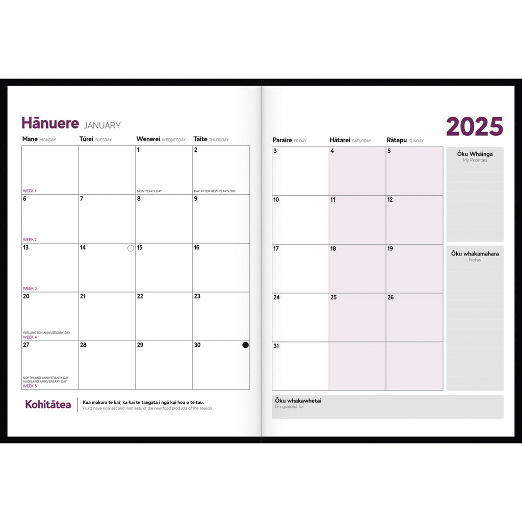 •A4 (205x255mm) with Month to View Mahere a marama layout on 100gsm white paper.