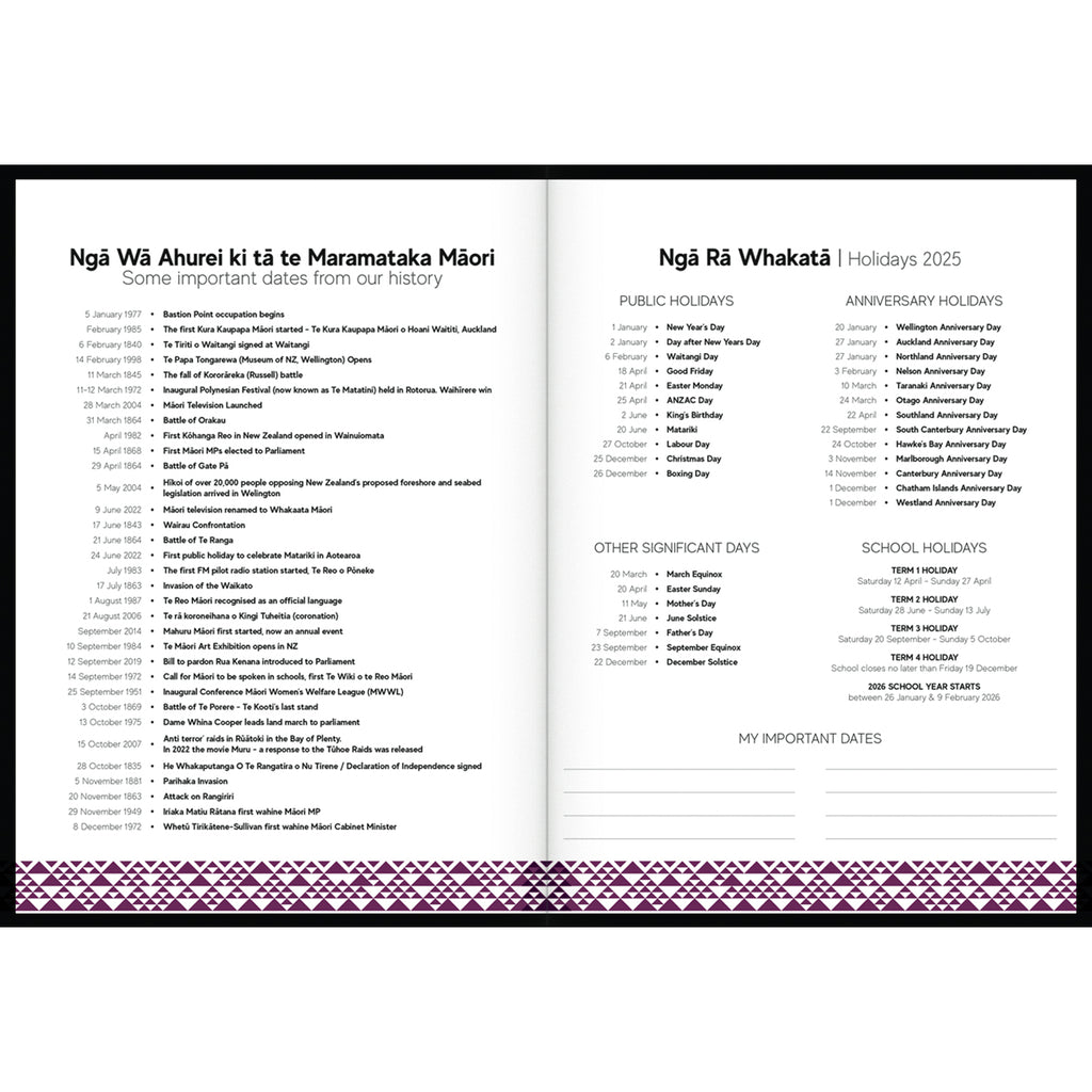 This Tuhi A4 Month To View Mahere a marama Planner has plenty of space for notes and appointments. The convenient month to view layout allows you to see the whole month at a glance. It includes Important Maori Dates, Public holidays & significant dates, as well as reference calendars and goal planners. Printed on 100gsm white paper stock with a flexible laminated matt cover with a unique Maori patterned design.