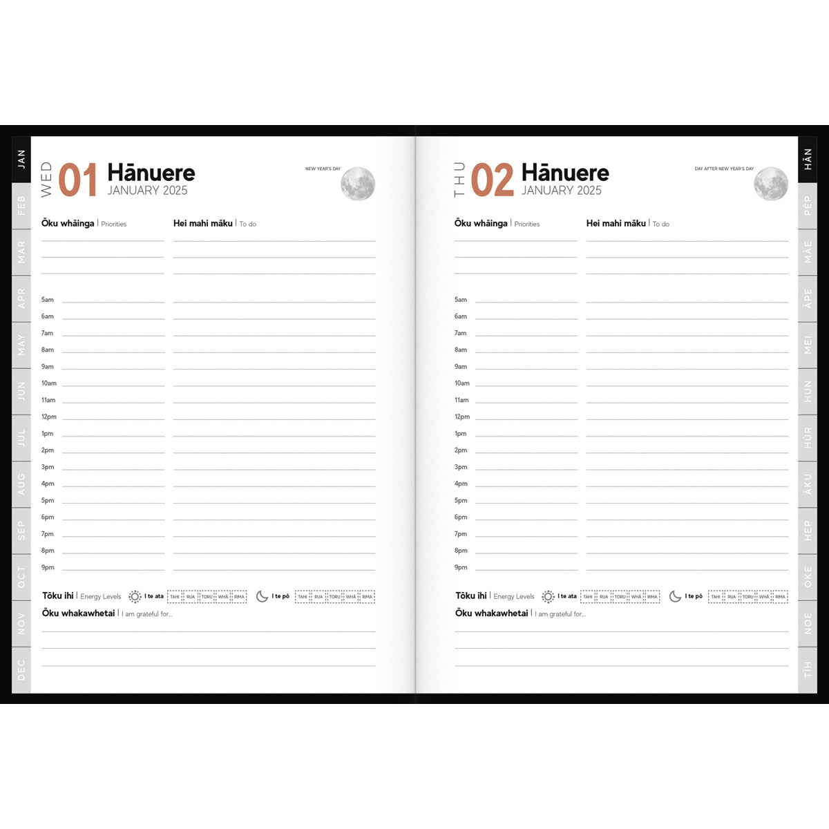 This Tuhi A51 Diary has a Day Per Page layout and printed on 80Ggsm white paper. It features a laminated red hard cover with a unique Maori design. It is a great way to stay organised and it has plenty of room for important appointments and tasks. It includes Important Maori dates, public holidays & other significant dates, Karakia, Korero, Ko wai au & Waiata to use, a Matariki & Maramataka Layout as well as weekly reflection and goal planners.
