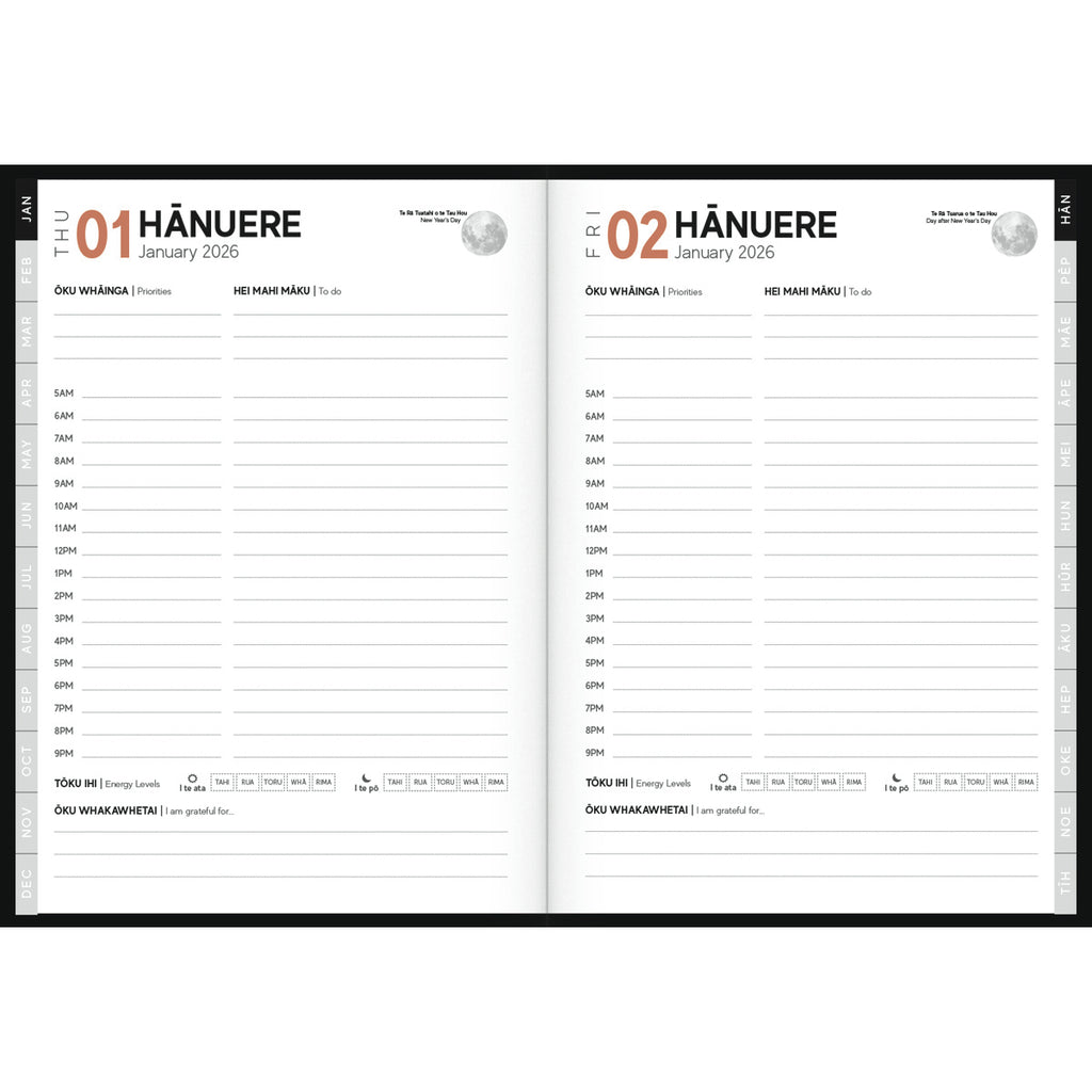 The Tuhi Rataka A5 Day Per Page Diary for 2026 is a beautifully designed planner that combines a sophisticated layout with a celebration of New Zealand's culture and language. This diary is a perfect way to keep track of your schedule while also learning about the Maori language.
