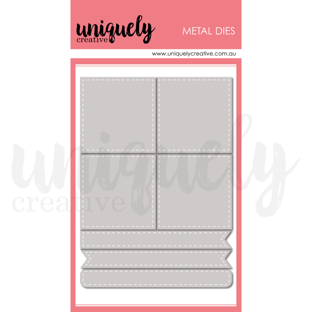 Approximate die size: 5 1/2" x 4" (base die); 1 3/4" x 1 3/4" (squares); 3 3/4" x 1/2" (banners)