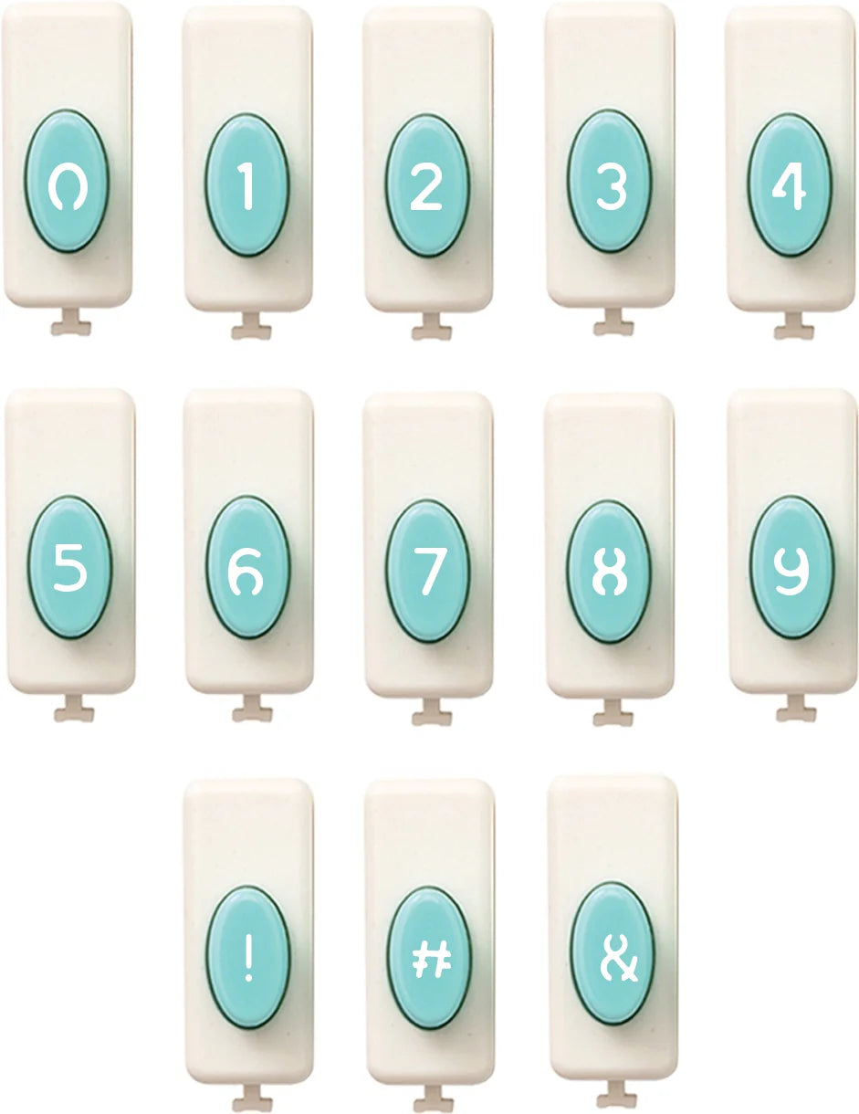 Easily punch numbers and symbols! Link together for easy storage. Use alone or with the Word Punch Board (661599); sold separately. Package measures approximately 5.25 x 8.75 x 1.5 inches. The set includes 13 punches of numbers 0 to 9 plus an exclamation point, number sign and ampersand.
