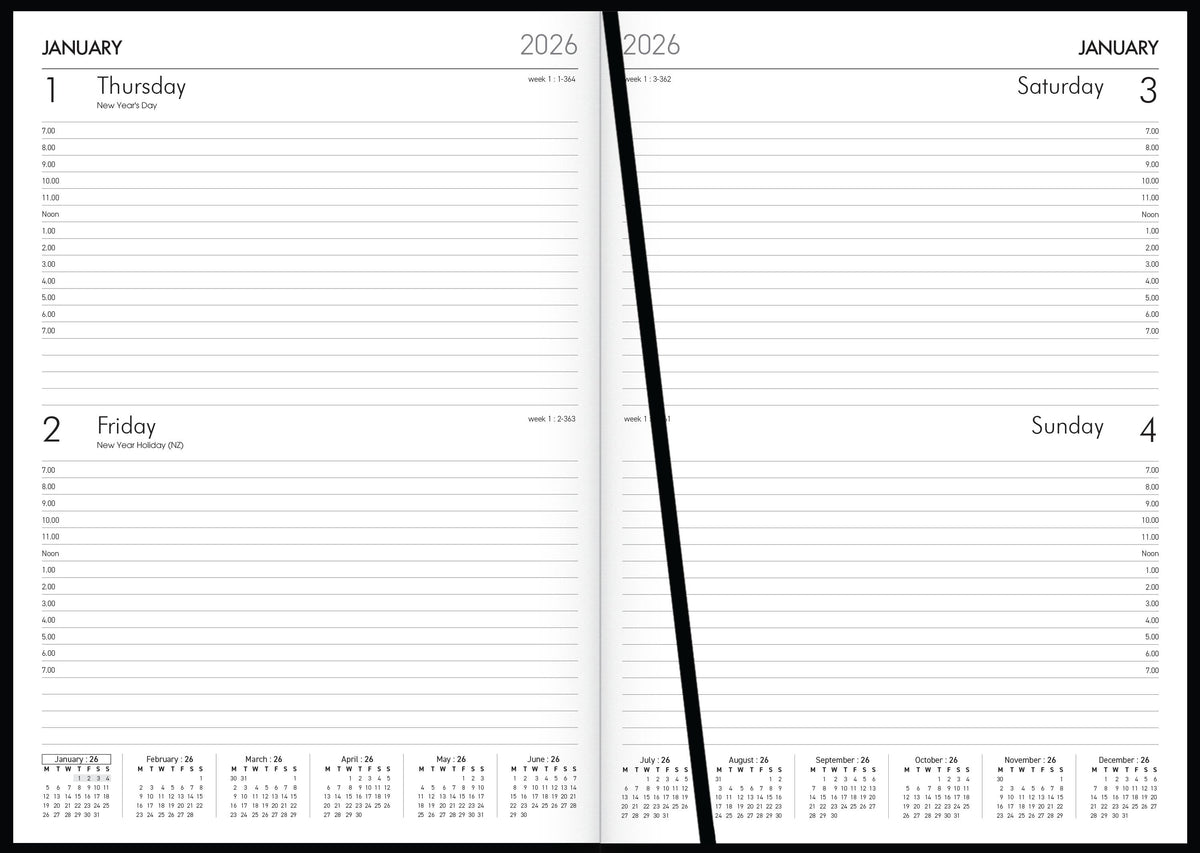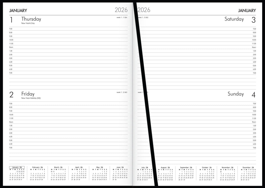 2 days to view. 70gsm FSC 70% mix certified white paper. Extensive information section. Appointment times. PVC coated paper cover material. Year on spine. FSC certified.
