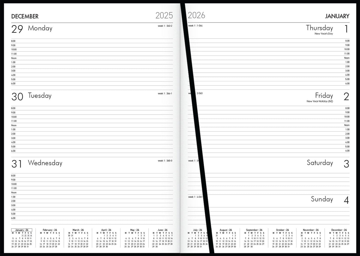 Week to view. 70gsm FSC 70% mix certified white paper. Extensive information section. Appointment times. PVC coated paper cover material. Year on spine.