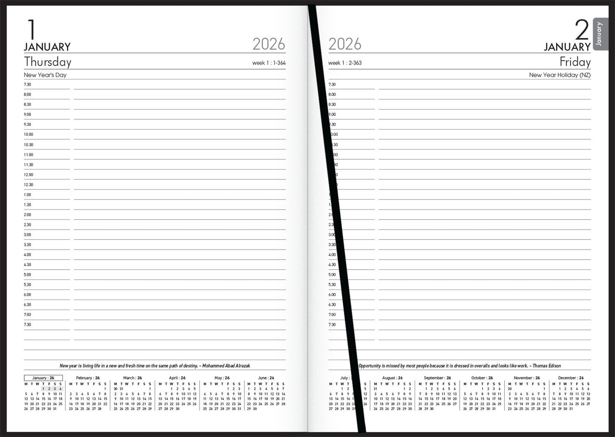 Day to view. 70gsm FSC 70% mix certified white paper. Extensive information section. Appointment times. PVC coated paper cover material. Year on spine. FSC certified.