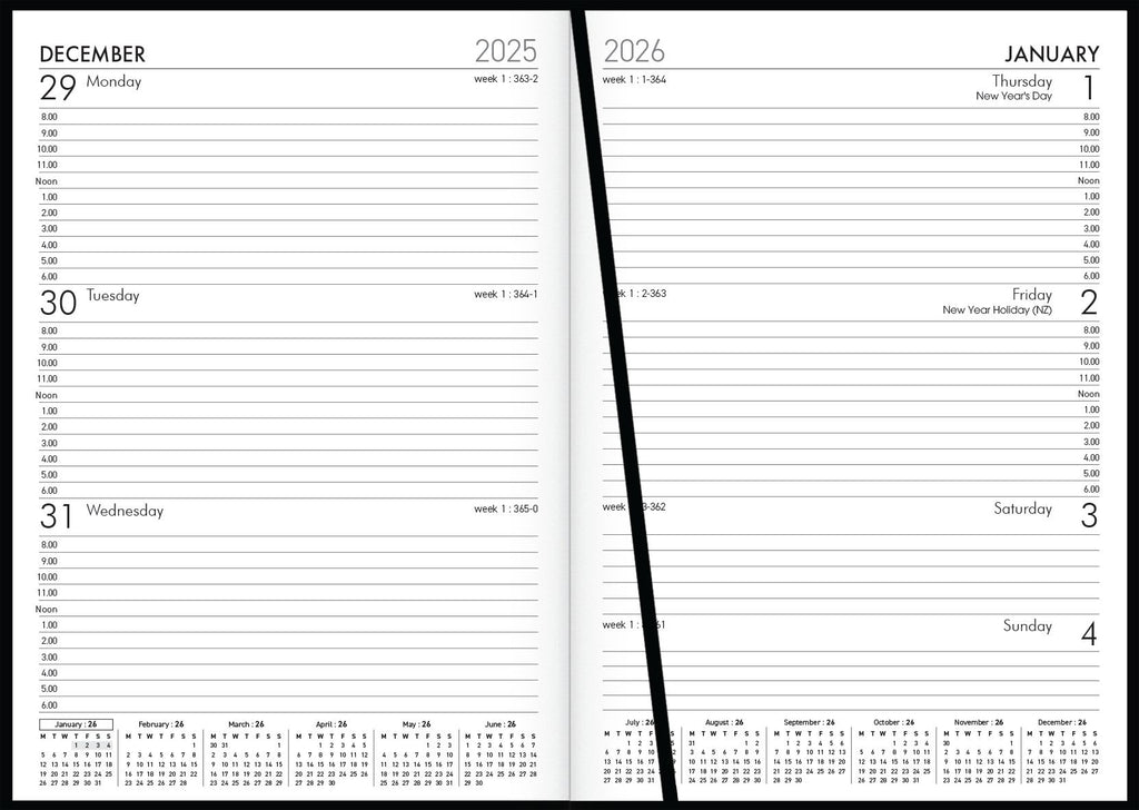 Week to view. 70gsm FSC 70% mix certified white paper. Extensive information section. Appointment times. PVC coated paper cover material. Year on spine.