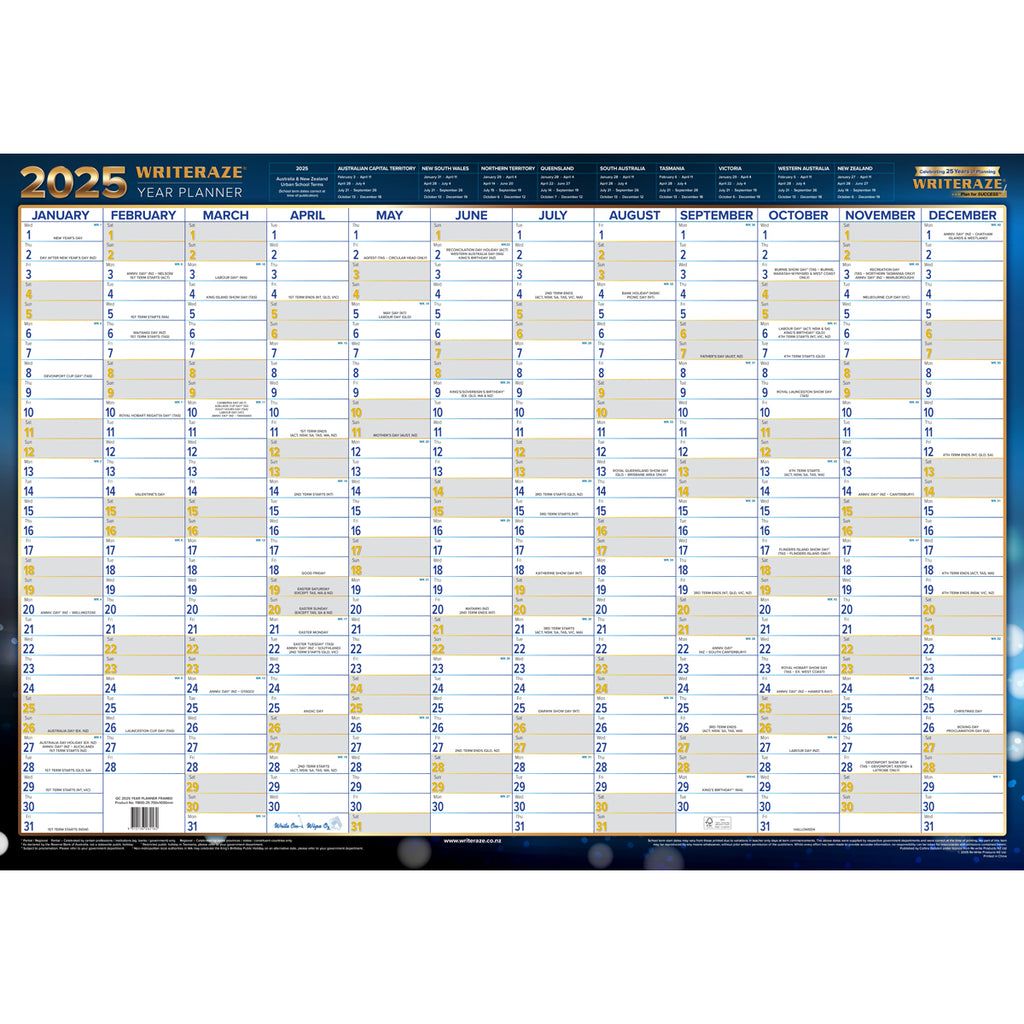 2025 laminated planner for write on/wipe off applications, supplied with quality dry erase marker, marker clip and adhesive mounting blocks. Includes all Australian and NZ holidays, important dates, with shaded weekends for easy weekly planning.