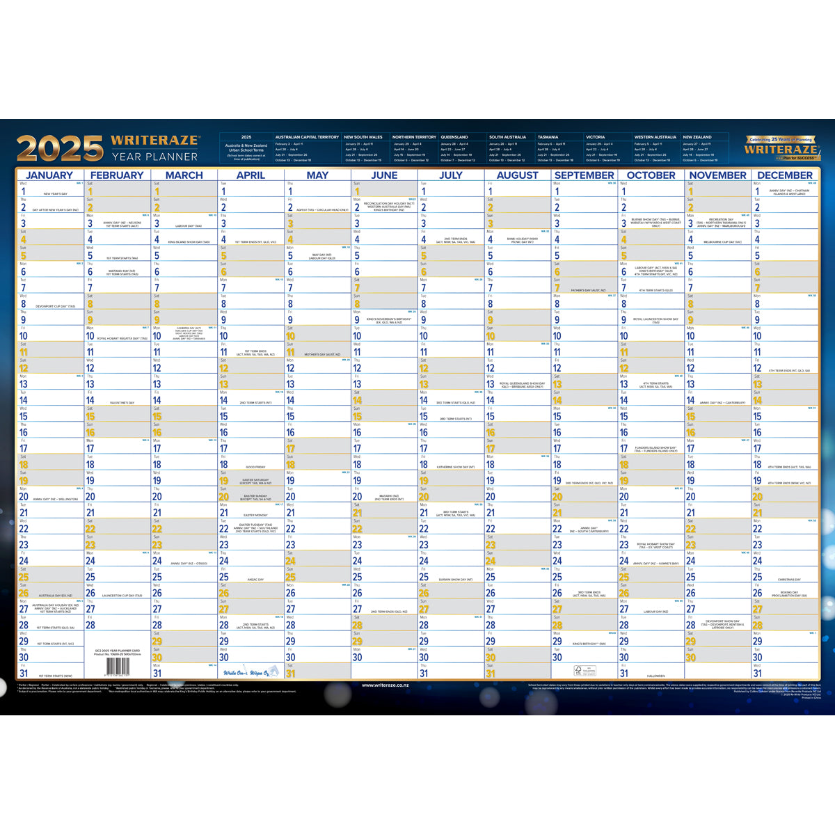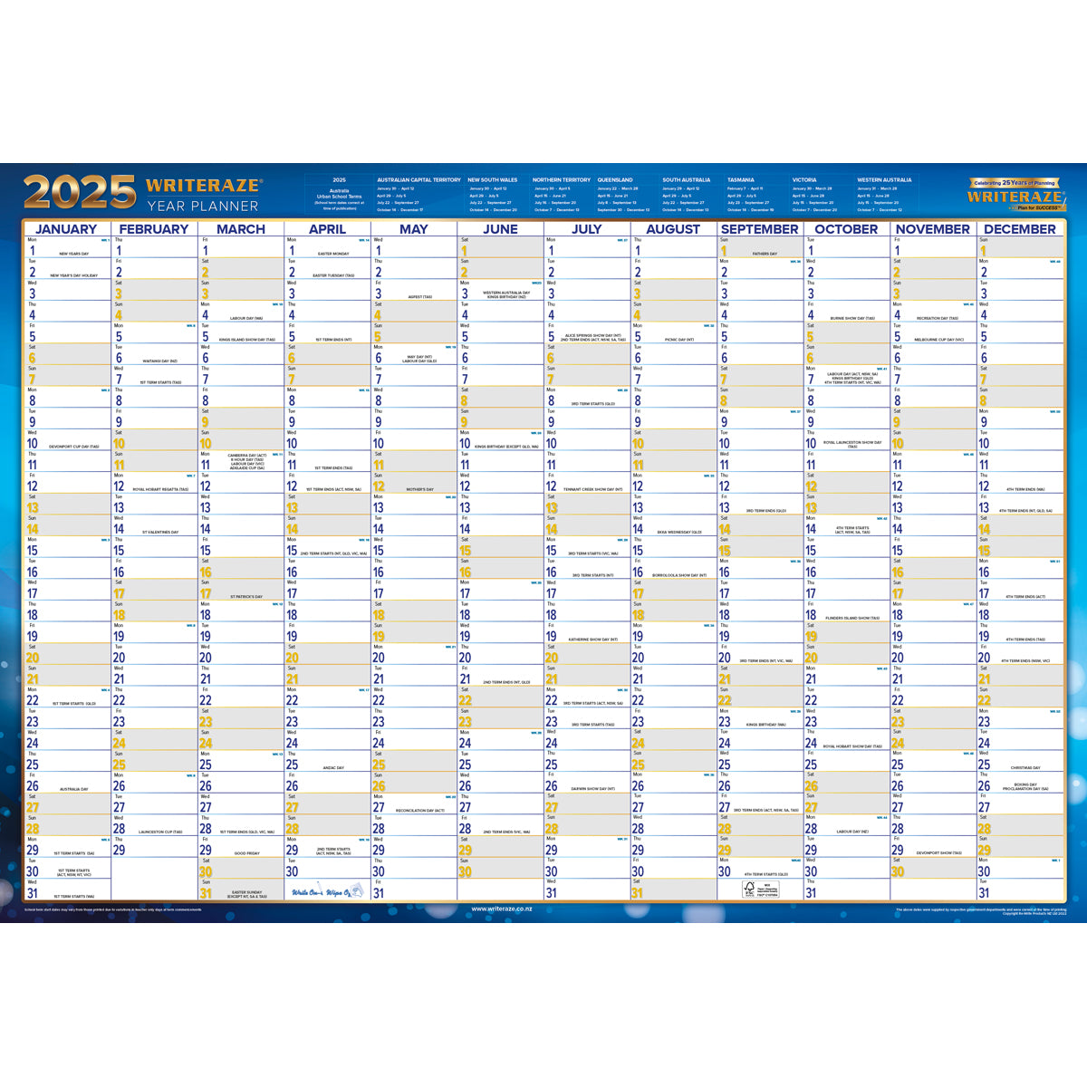 2025 laminated planner for write on/wipe off applications, supplied with quality dry erase marker, marker clip and adhesive mounting blocks. Includes all Australian and NZ holidays, important dates, with shaded weekends for easy weekly planning.