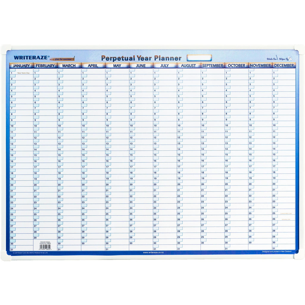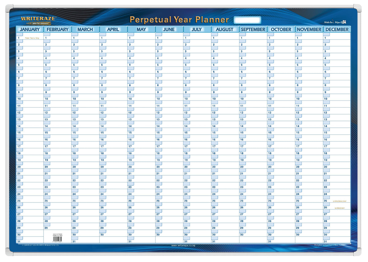 Writeraze laminated planner for write on/wipe off applications, supplied with quality dry erase marker, marker clip and adhesive mounting blocks. Includes all New Zealand and Australian holidays and important dates, with shaded weekends for easy weekly planning. Size: 500x700mm. Framed.